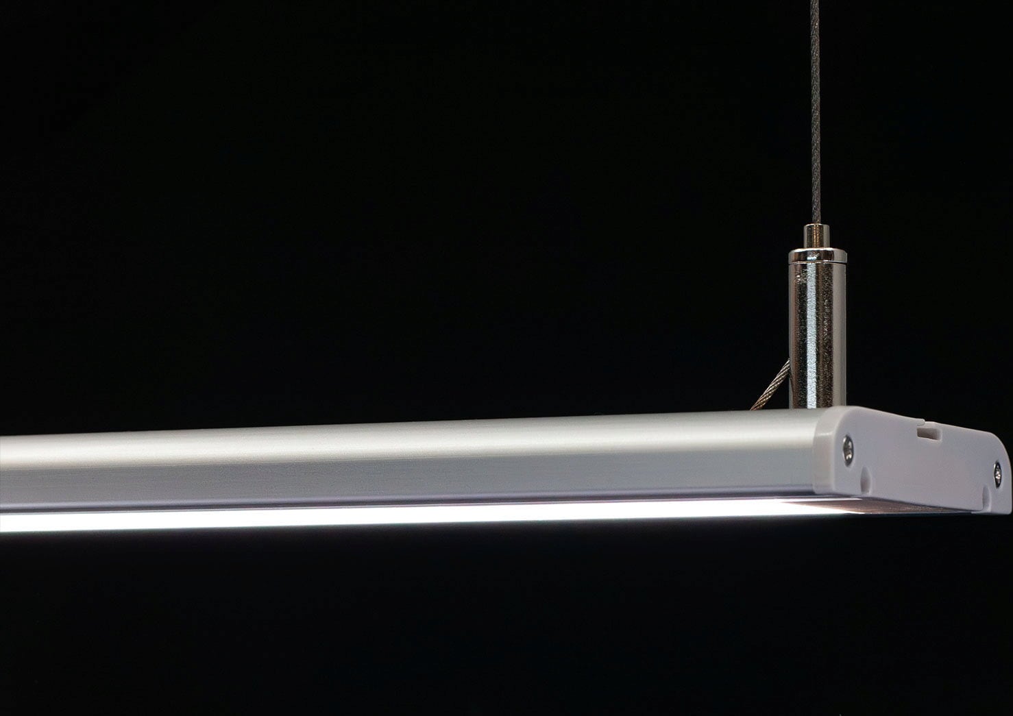 Tenké hliníkové tělo svítidla zaujme svým minimalistickým designem. Díky této decentní estetice ustupuje samotná lampa do pozadí – a nechává vyniknout světlo, které září naplno.