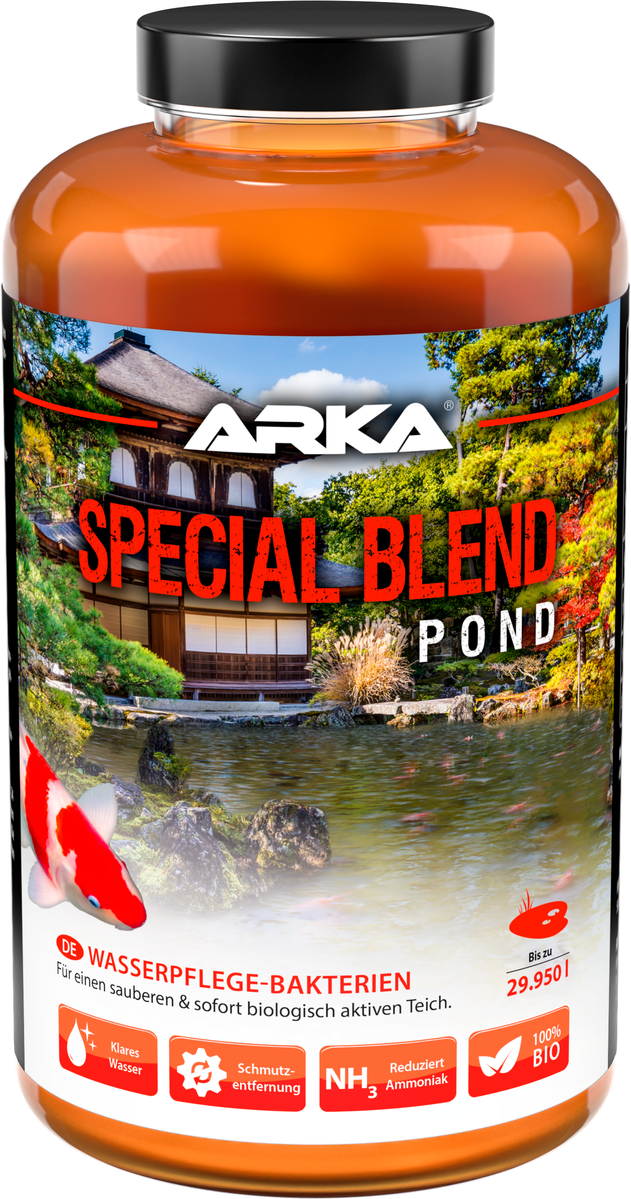 ARKA Special Blend Pond zvyšuje, díky prospěšným bakteriálním kulturám, aktivitu přirozené biologie jezírka. Výsledkem je čistá voda a bujný růst rostlin. Pracovité bakteriální kmeny rozkládají organické látky, a tím snižují nároky na čištění a údržbu. Tento 100% biologický přípravek může zpočátku uvolňovat mírný sirný zápach, který však rychle mizí. Lze jej používat již při teplotě vody od 7 °C, přičemž hodnota pH vody nemá vliv na jeho účinnost.