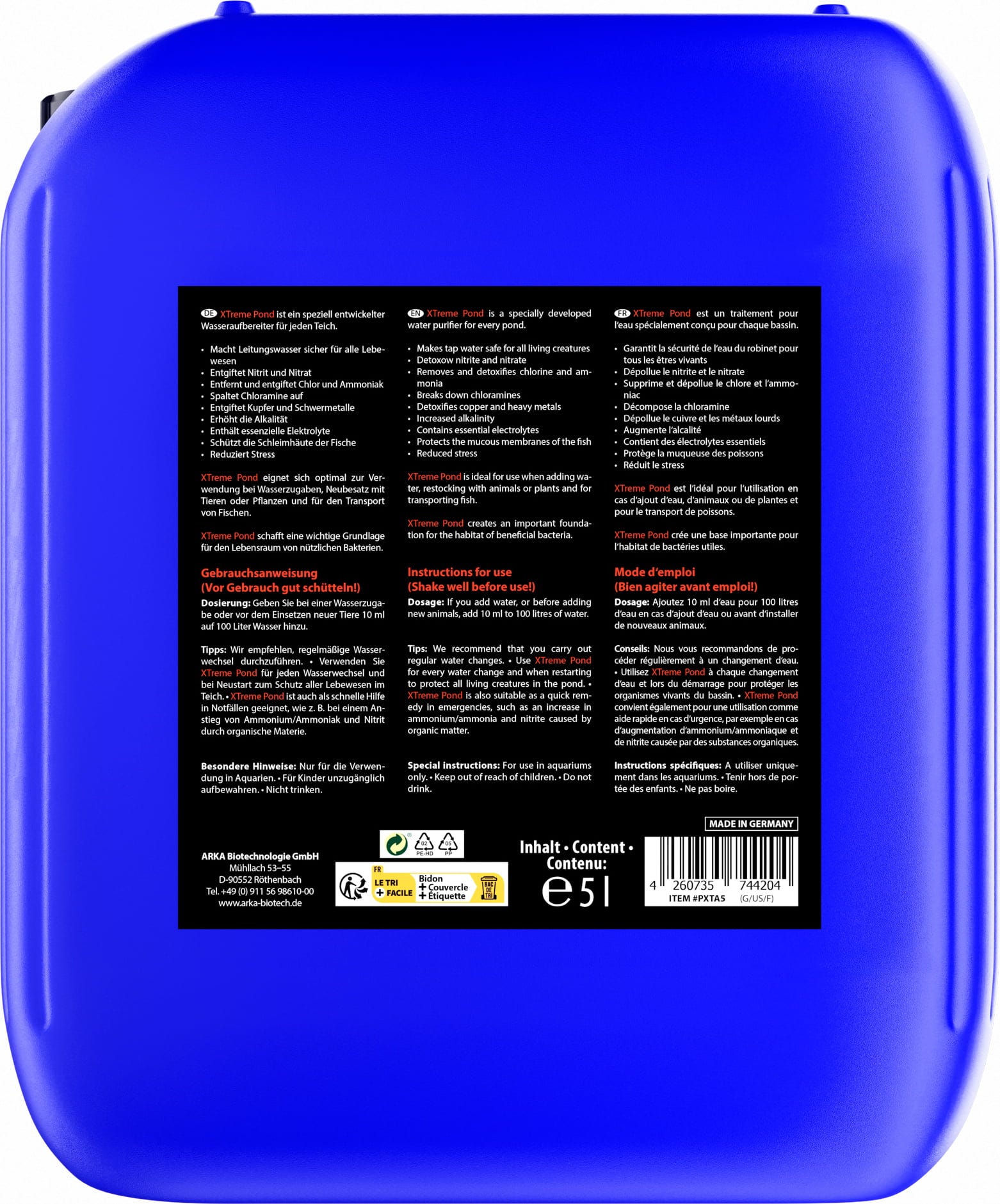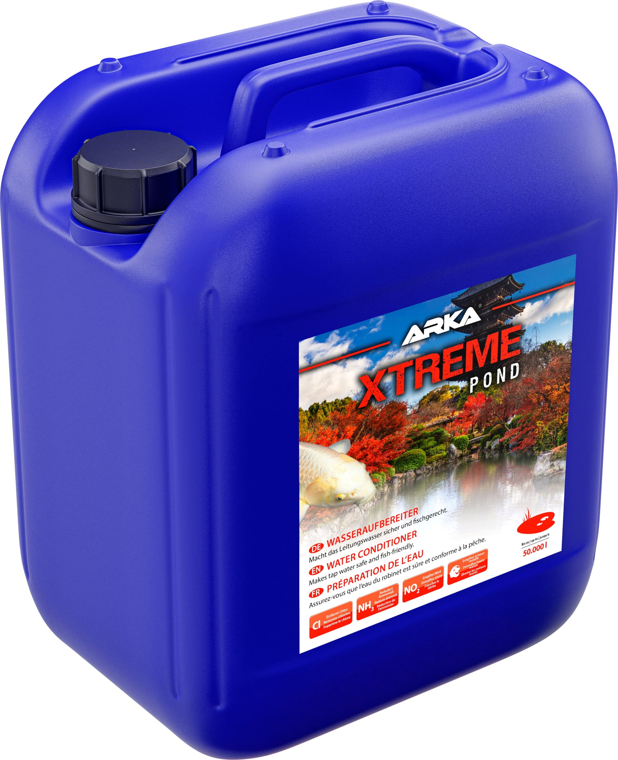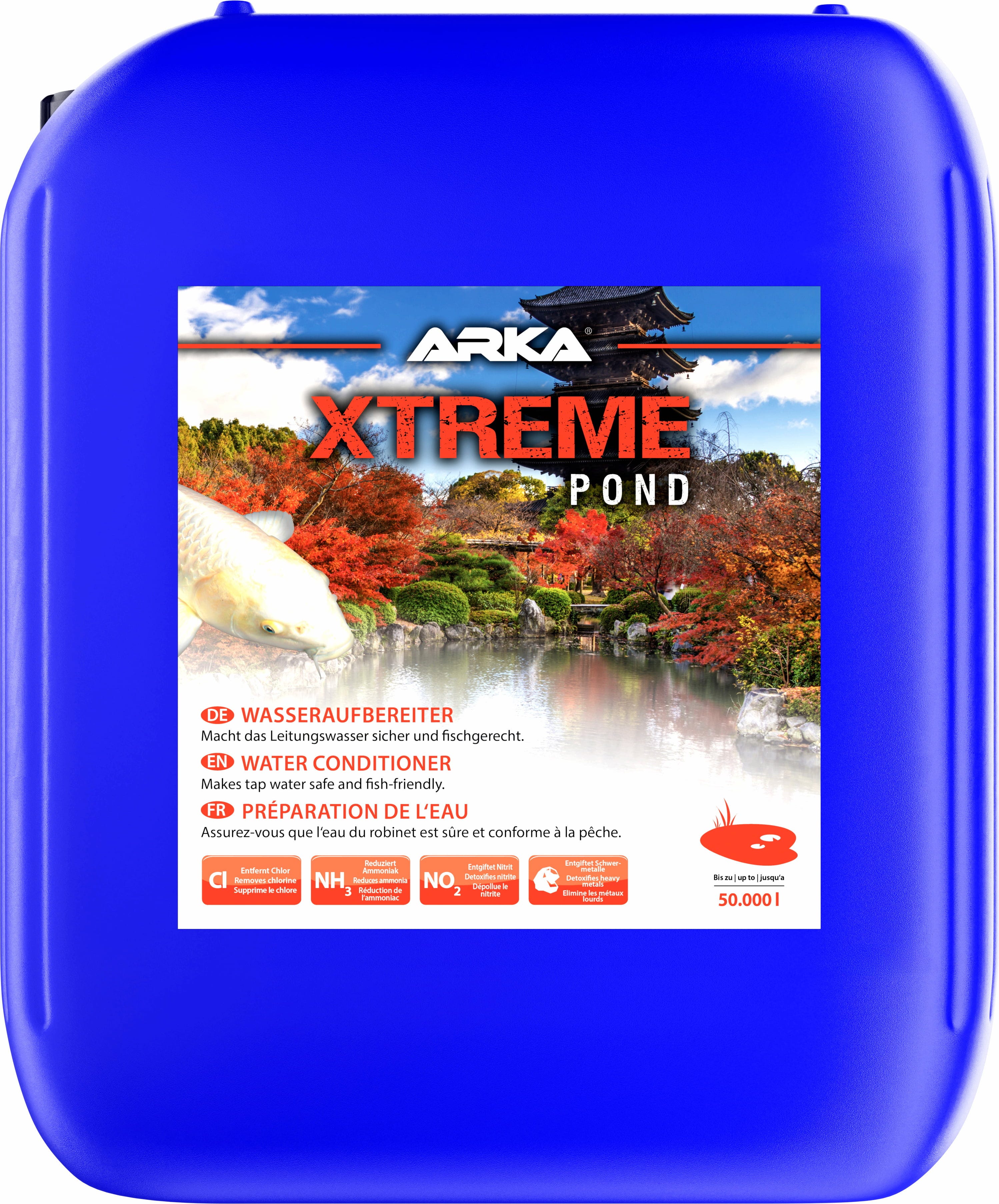 XTreme Pond od společnosti ARKA byl vyvinut speciálně pro jezírka, aby bezpečně ošetřil vodu z vodovodu pro všechny živé organismy včetně užitečných bakterií. Přípravek na úpravu vody obsahuje nezbytné elektrolyty a detoxikuje a odstraňuje těžké kovy a látky, které jsou škodlivé pro ryby. Přípravek také odbourává chloraminy a zvyšuje alkalitu. Chrání sliznice ryb a snižuje jejich stres. Přípravek byl vyvinut pro pravidelné používání, ale je vhodný i pro mimořádné situace, jako je akutní zvýšení hladiny amoniaku/čpavku apod.