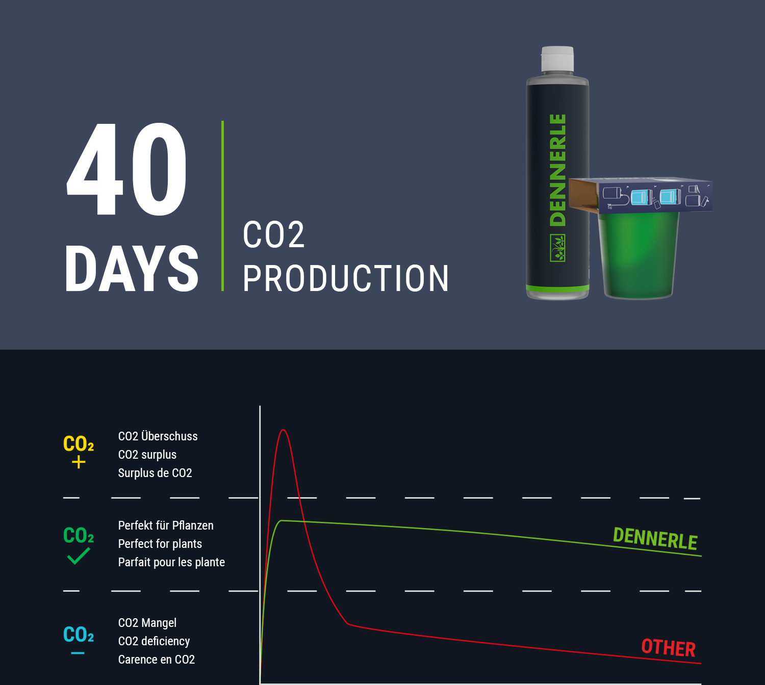 Cenný uhlík vzniká přirozenou reakcí. Speciální mikroorganismy s CO2 Constant-Gel od Dennerle zajišťují minimálně 40 dní stabilní produkci CO2. Běžné Bio CO2 systémy na bázi cukru produkují CO2 nepravidelně, a jsou proto méně vhodné.
