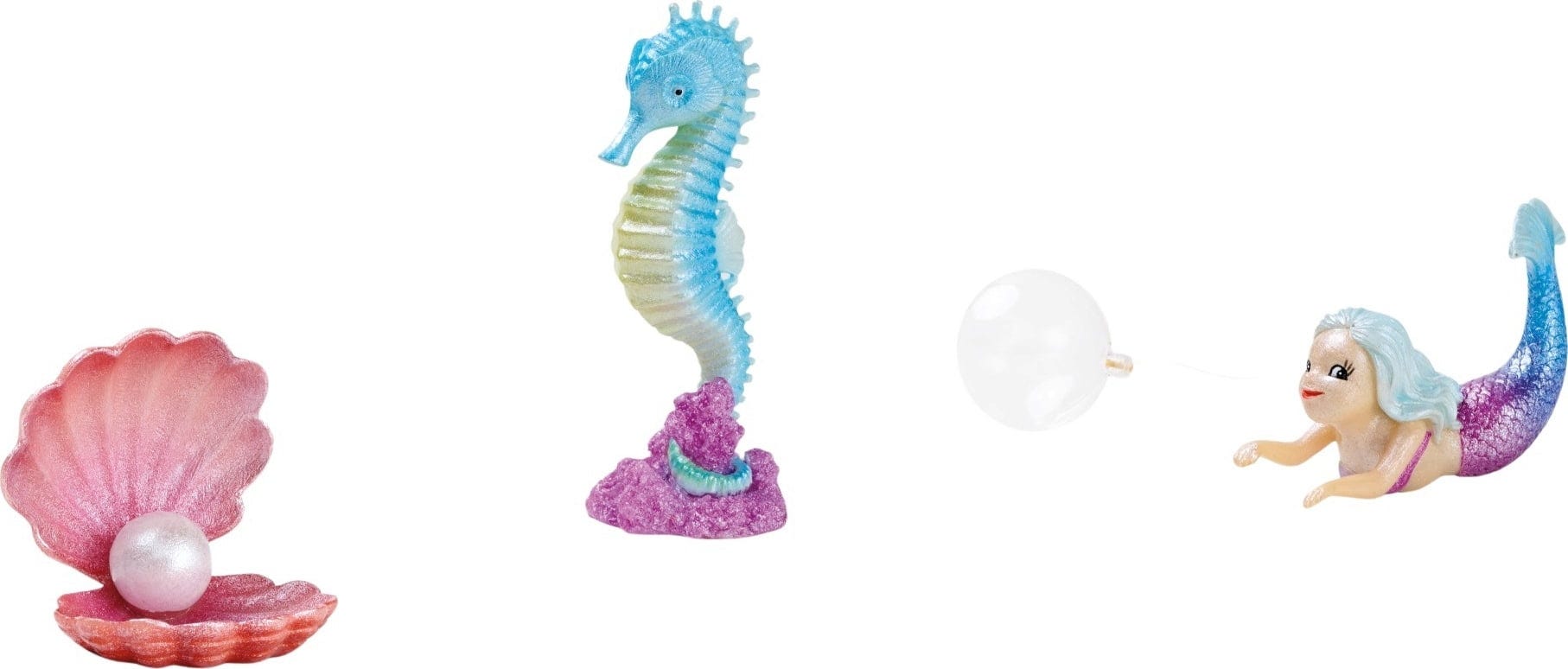 Součástí sady je také mušle s perlou a mořský koník – všechny prvky jsou pokryty jemným třpytivým leskem, díky kterému se sada stane opravdovým skvostem Vaší podvodní scenérie.