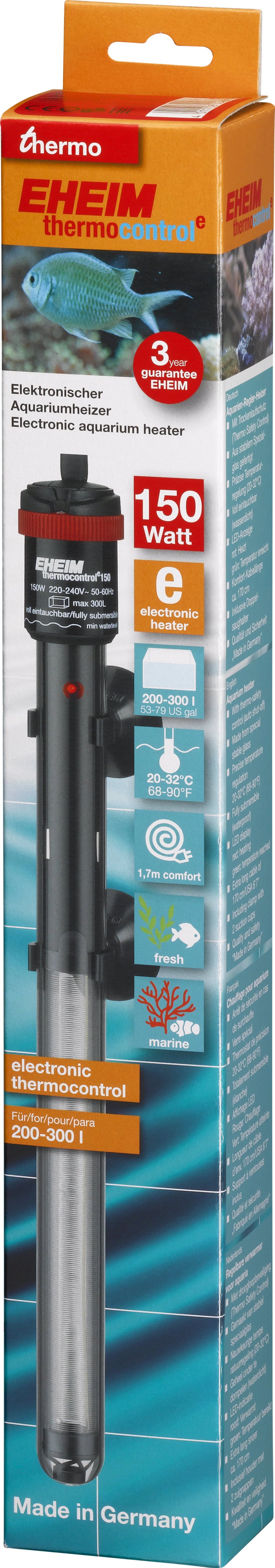 Ohřívač thermocontrol e značky Eheim se jednoduše vloží do vody a ohřeje ji. Teplotu lze přesně nastavit a měřit pomocí elektroniky. Plášť ze speciálního laboratorního skla zvětšuje ohřívací plochu, působí jako bariéra a zajišťuje rovnoměrný tepelný výkon.