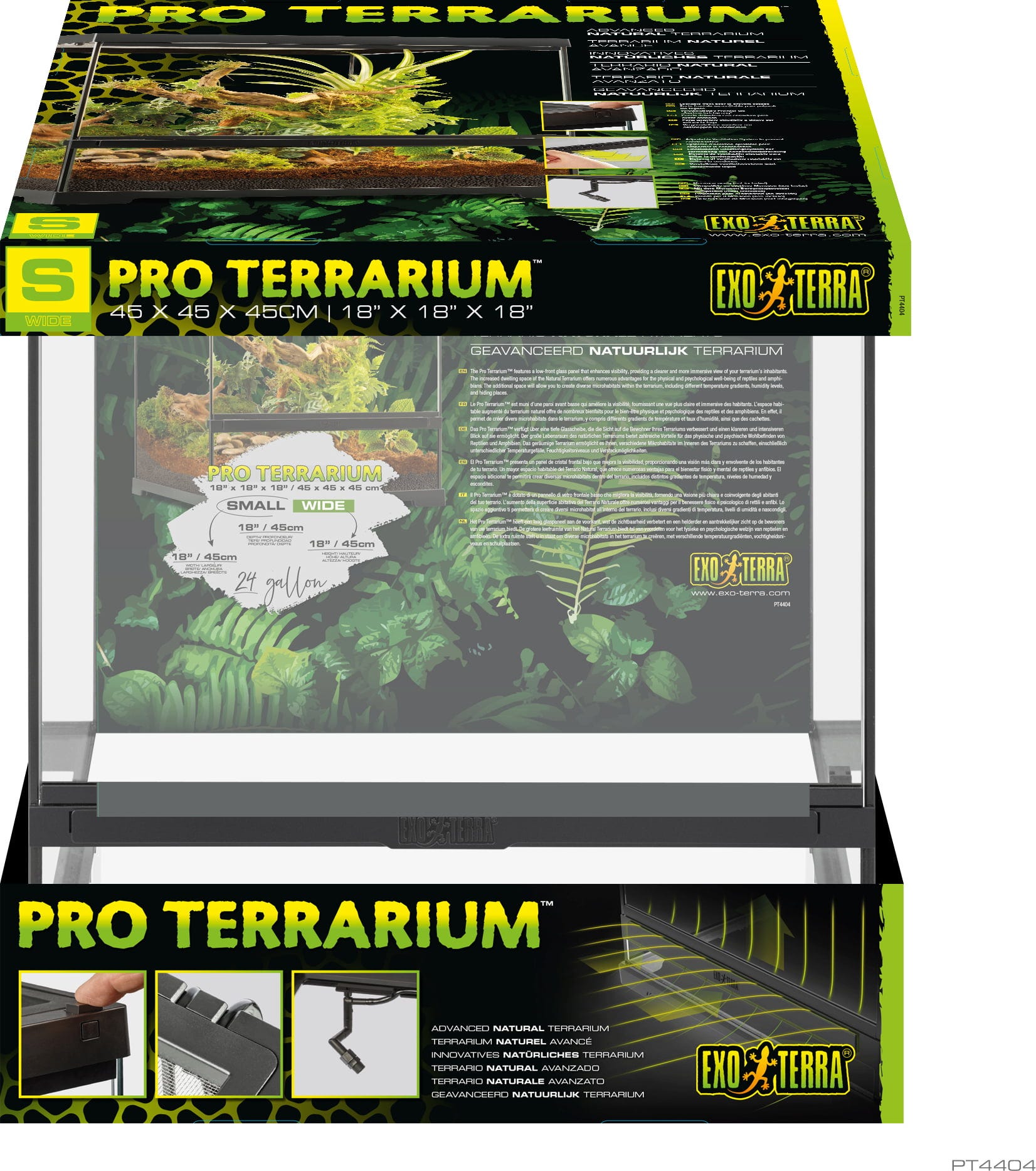 S teráriem EX Pro Terrarium si pořídíte skutečné mistrovské dílo evropské herpetologie přímo k Vám domů a vytvoříte pro Vaše plazy, obojživelníky nebo bezobratlé prostředí, které splňuje všechny požadavky! Extra hluboké přední sklo Vám poskytuje křišťálově čistý a nezkreslený pohled na Vaše chovance, zatímco uvnitř můžete bez námahy vytvářet různé klimatické zóny a úkryty.