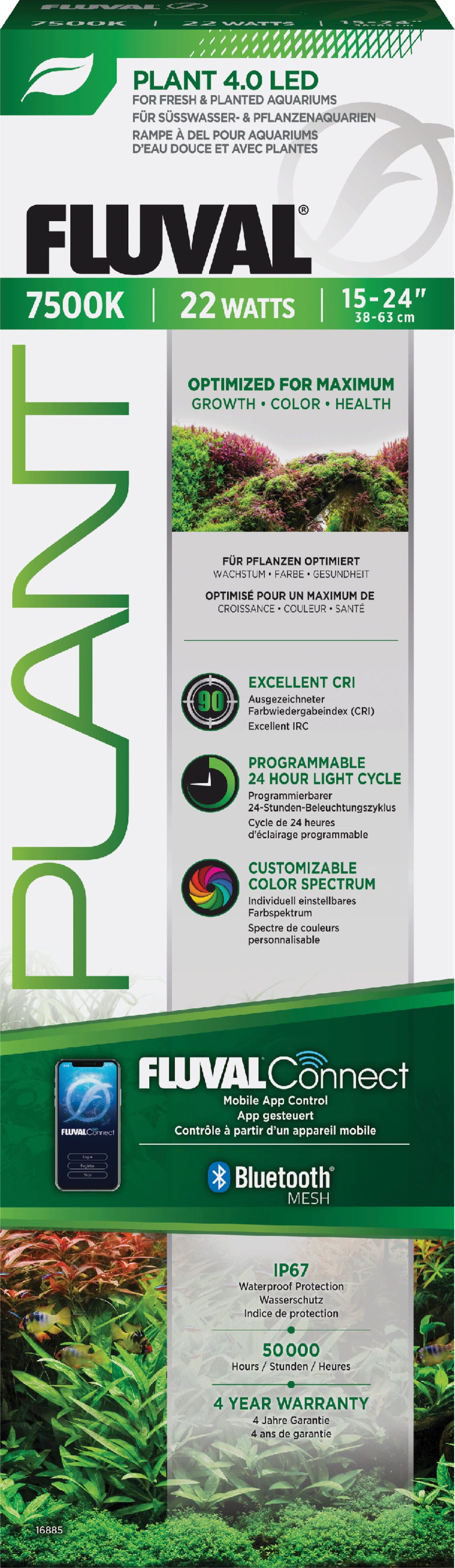 S Fluval Plant 4.0 LED podpoříte růst Vašich akvarijních rostlin na zcela nové úrovni! Prostřednictvím aplikace FluvalConnect ovládáte výkonné plnospektrální osvětlení pohodlně ze svého smartphonu a jednotlivé barevné kanály nastavujete přesně podle Vašich požadavků. Jedinečným prvkem jsou dvě LED desky umístěné pod různými úhly, které zajišťují maximální rozptyl světla a minimalizují vznik stínových zón.