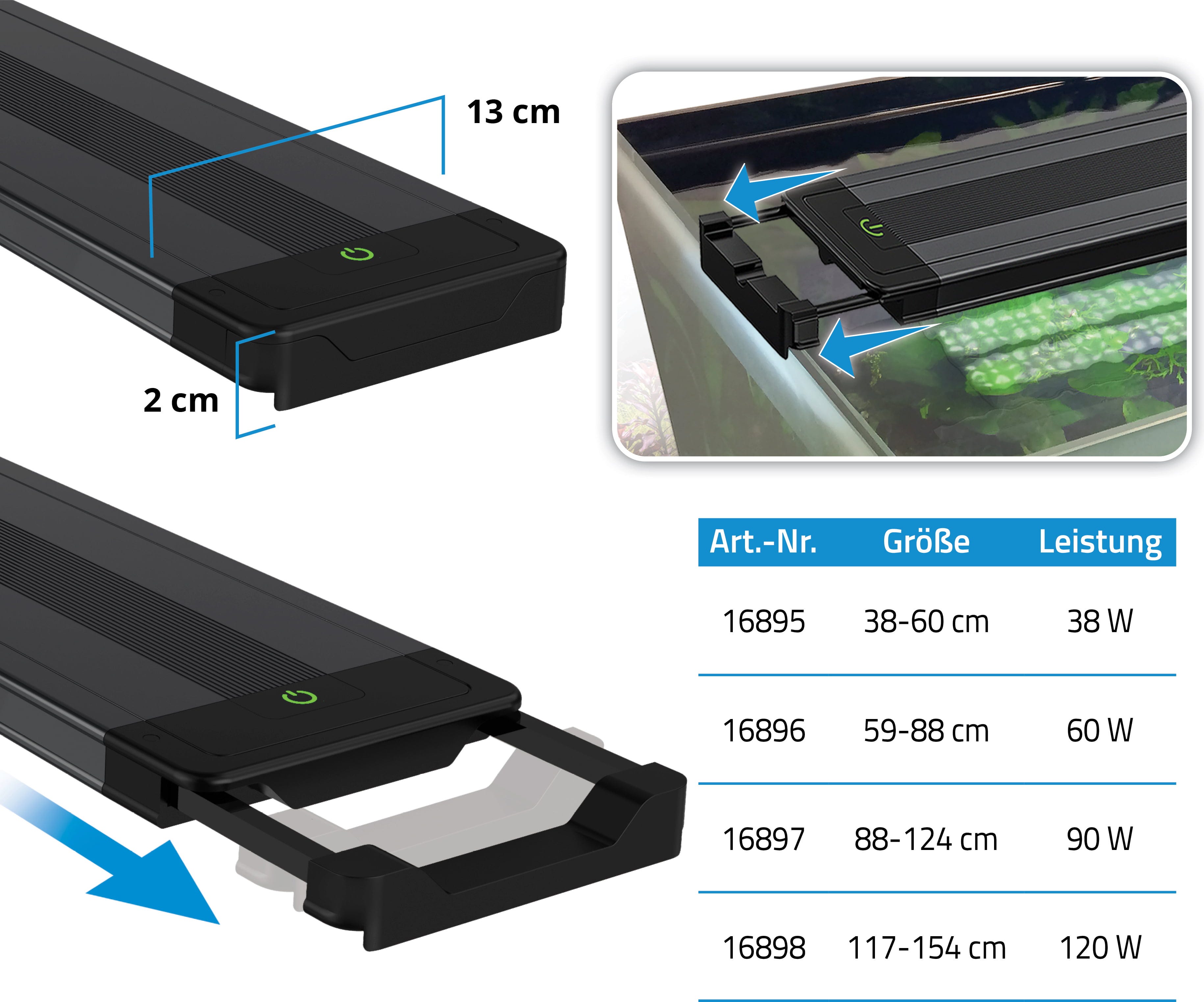 Pomocí aplikace FluvalConnect máte plnou kontrolu nad šesti spektrálními pásmy a můžete snadno programovat přirozené denní cykly nebo světelné efekty. Štíhlé hliníkové tělo je chráněno proti vlhkosti, zatímco kvalitní skleněná optika zajišťuje vysokou účinnost světla. Ať už svítidlo umístíte pomocí výsuvných držáků přímo na akvárium, nebo jej elegantně zavěsíte nad sladkovodní aquascape pomocí přiložené závěsné sady, tato profesionální LED vyvinutá v Německu splňuje vysoké nároky na osvětlení.