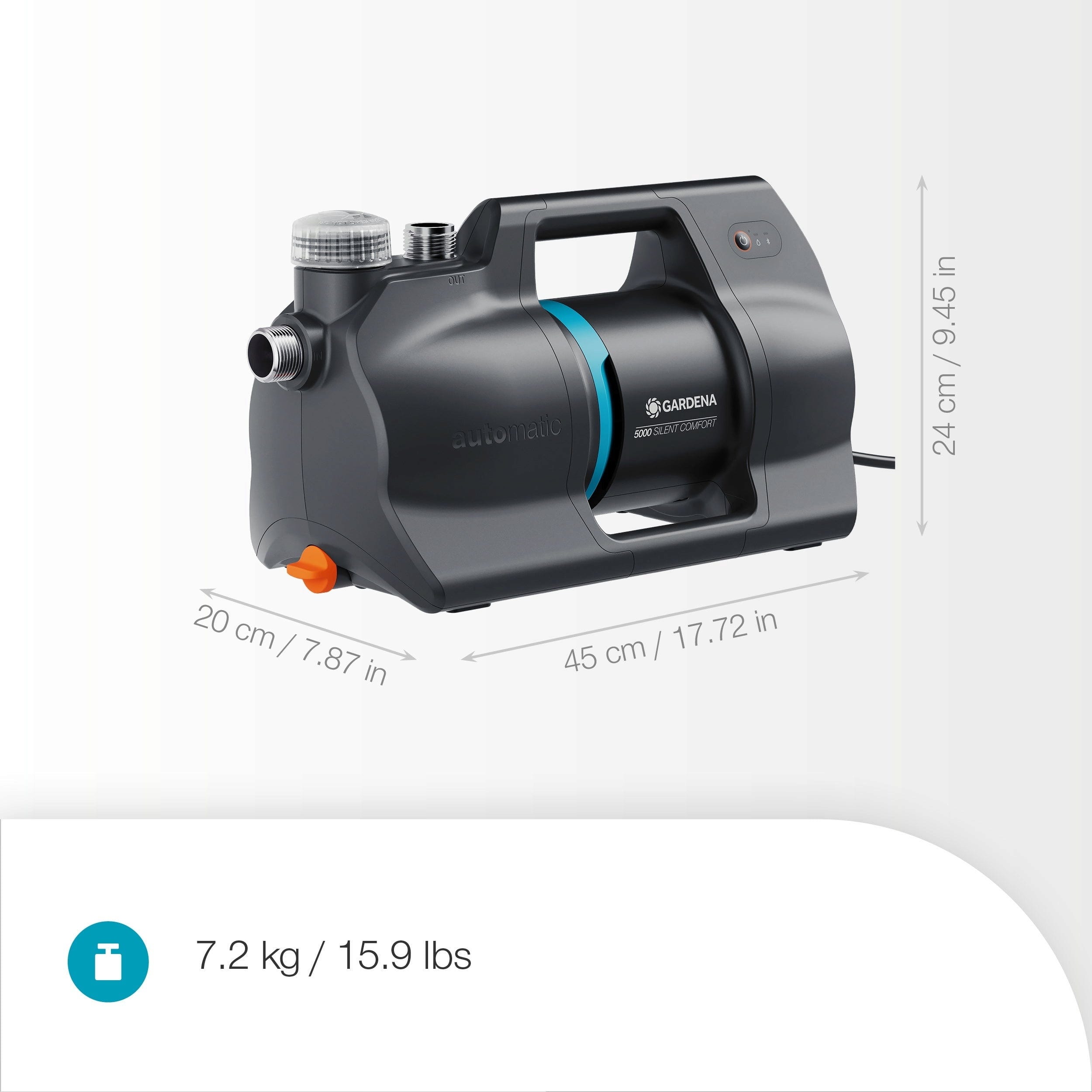 Domácí a zahradní automat 5000 SilentComfort je inteligentní centrála pro Vaše vodní hospodářství! Jakmile spláchnete toaletu, spustíte pračku nebo Váš zavlažovač trávníku vyžádá vodu, automat se velmi tiše zapne, aby zajistil rovnoměrné zásobování vodou. Díky inovativní technologii Silent je zařízení při provozu tak nenápadné jako moderní lednice, takže jej můžete bez problémů umístit v domě nebo přímo na terase, aniž by narušovalo klid.