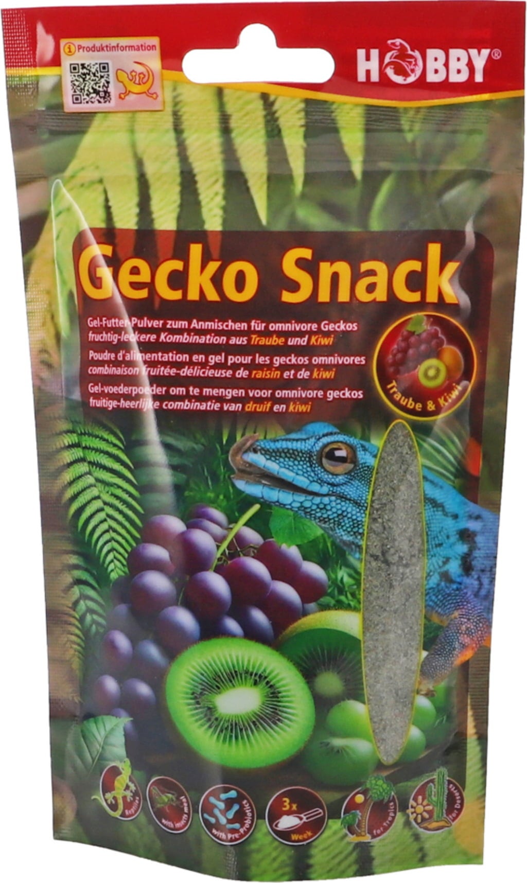 Hobby Gecko Snack je prášek pro přípravu ovocného gelového krmiva, který byl speciálně vyvinut pro všežravé gekony. Výborně se hodí jako doplněk k základnímu krmivu a lze jej podávat i společně s živým hmyzem.