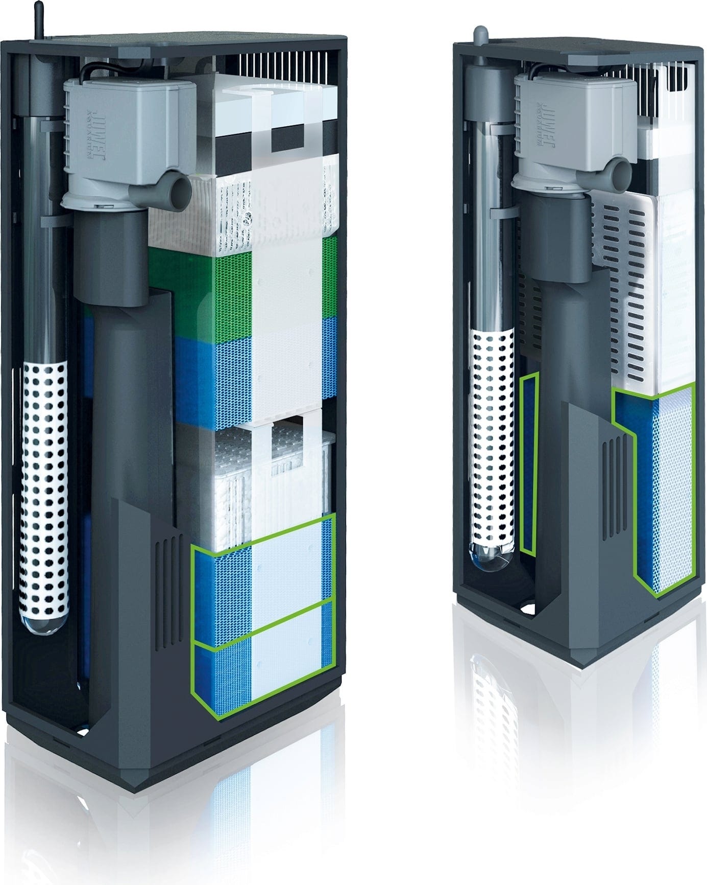 Filtry JUWEL Bioflow jsou vybaveny vysoce účinným a velmi tichým oběhovým čerpadlem Eccoflow, jehož výkon je podle vědeckých kritérií přizpůsoben velikosti filtračního systému. Filtry Bioflow jsou navíc připraveny pro použití topítek JUWEL, která jsou optimálně integrována do vodního okruhu a zajišťují rovnoměrné rozložení tepla ve všech částech Vašeho akvária. Filtrační systém Bioflow nevyužívá hadicové spojky snižující výkon, které jsou často příčinou netěsností. Systém Bioflow tak představuje bezpečný způsob filtrace vody v akváriu.