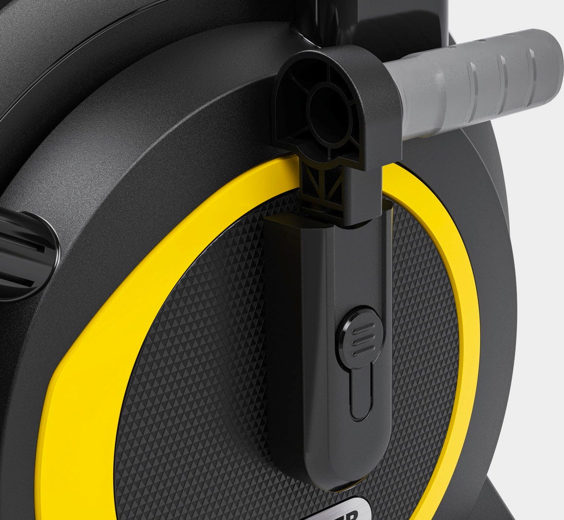 Pomocí ergonomické kliky lze hadici rychle a kontrolovaně navinout. Stabilní podstavec přitom zajišťuje bezpečné stání během používání. Výškově nastavitelná rukojeť navíc usnadňuje přepravu po zahradě a umožňuje komfortní manipulaci.