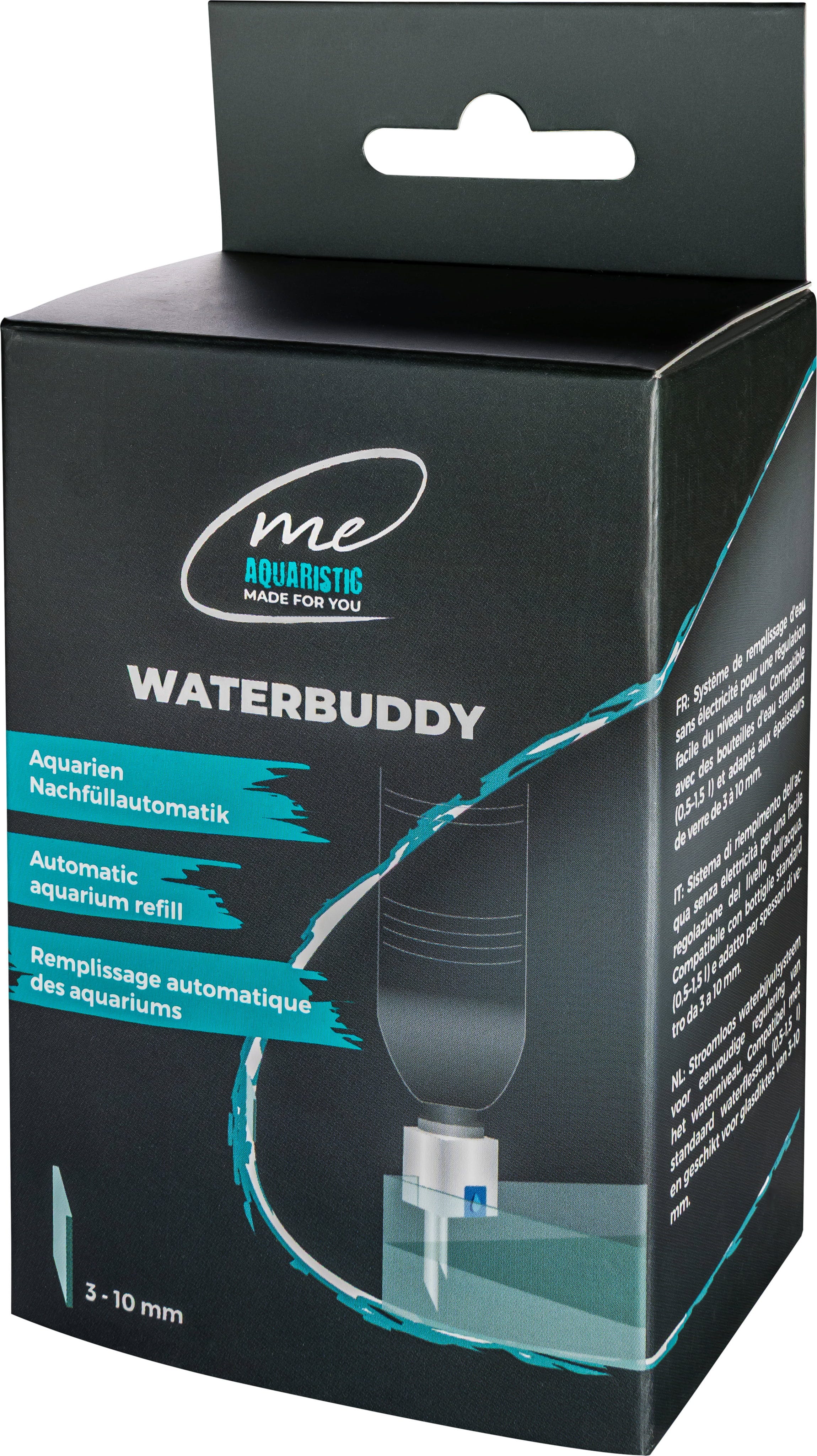 Waterbuddy je univerzální a vhodný pro tloušťku skla 3 až 10 mm. Po instalaci je ihned připraven k použití a spolehlivě zajišťuje, že hladina vody zůstává stále na ideální úrovni. Zajistěte si toto jednoduché a spolehlivé řešení pro automatickou regulaci hladiny vody ve Vašem akváriu.