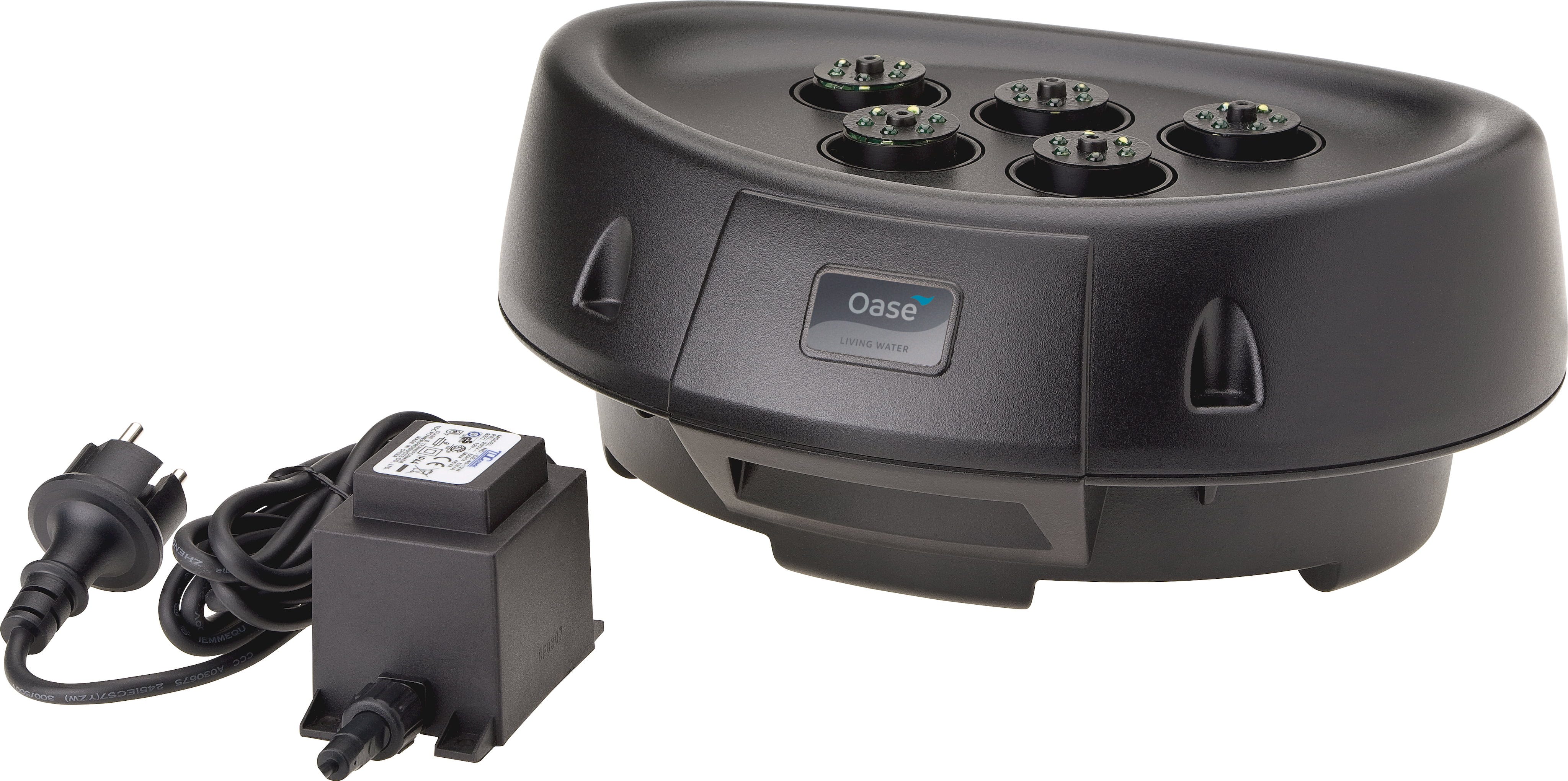 Díky pěti integrovaným tryskám si můžete užívat rozmanité fontány, které dosahují výšky až 70 cm a jsou perfektně zvýrazněny teple bílými LED kroužky. Protože společnost Oase používá obzvlášť bezpečnou a úspornou 12 V technologii, můžete vodní prvek bez obav používat dokonce i ve Vašem koupacím jezírku, zatímco si sami užíváte osvěžující vodu.