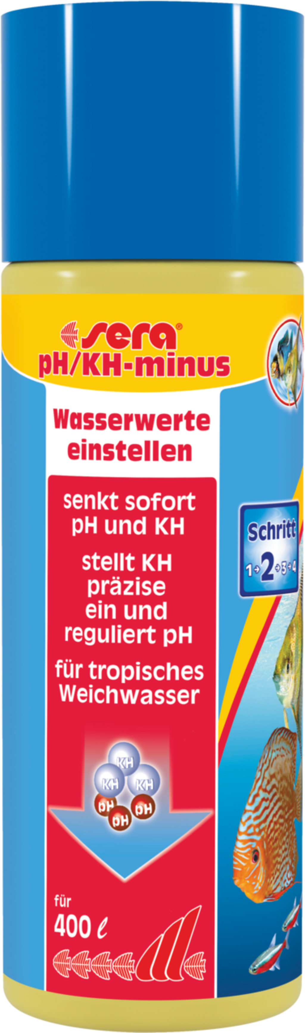 Sera pH/ KH minus je tekutý přípravek na úpravu vody, který snižuje uhličitanovou tvrdost i hodnotu pH ve sladkovodních akváriích a je k dispozici v různých baleních.