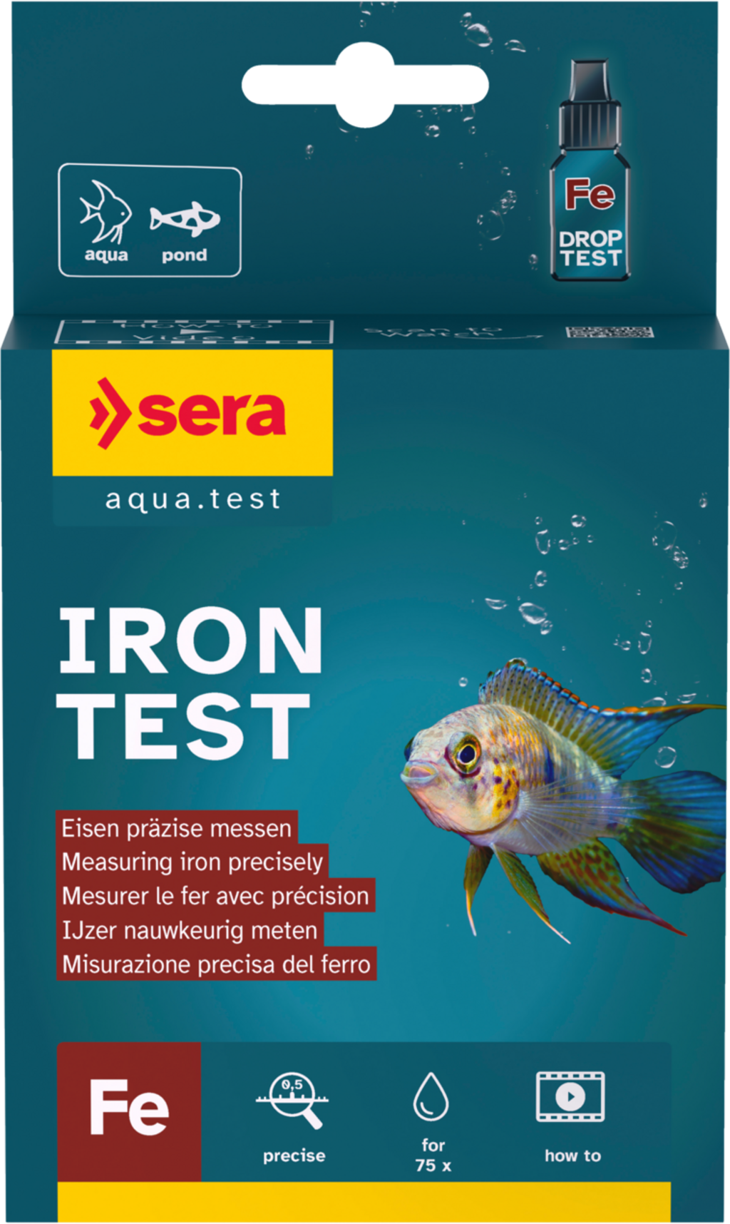 Sera Fe-Test je vodní test pro kontrolu obsahu železa ve sladkovodních a mořských akváriích, stejně jako v zahradních jezírkách.