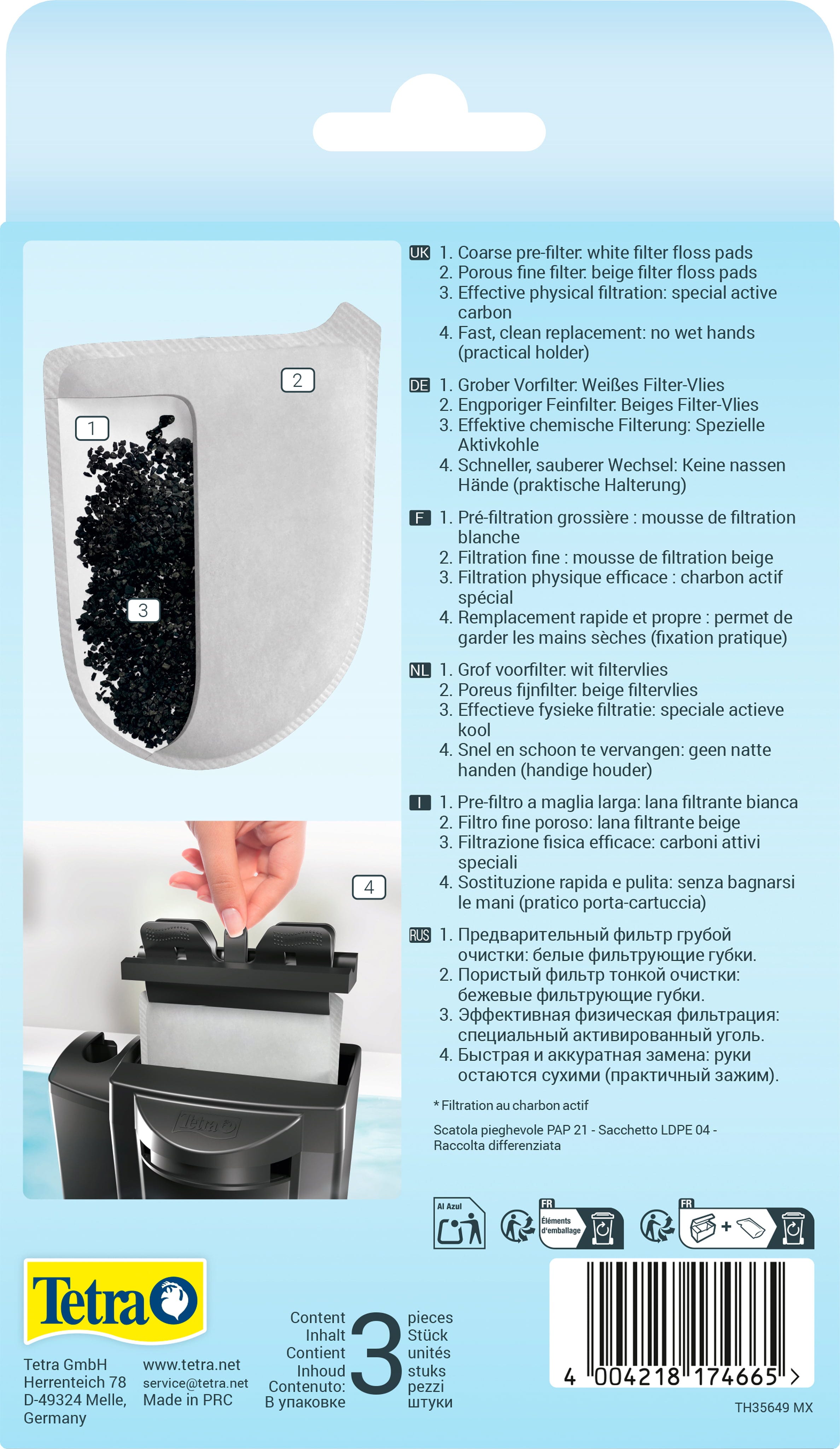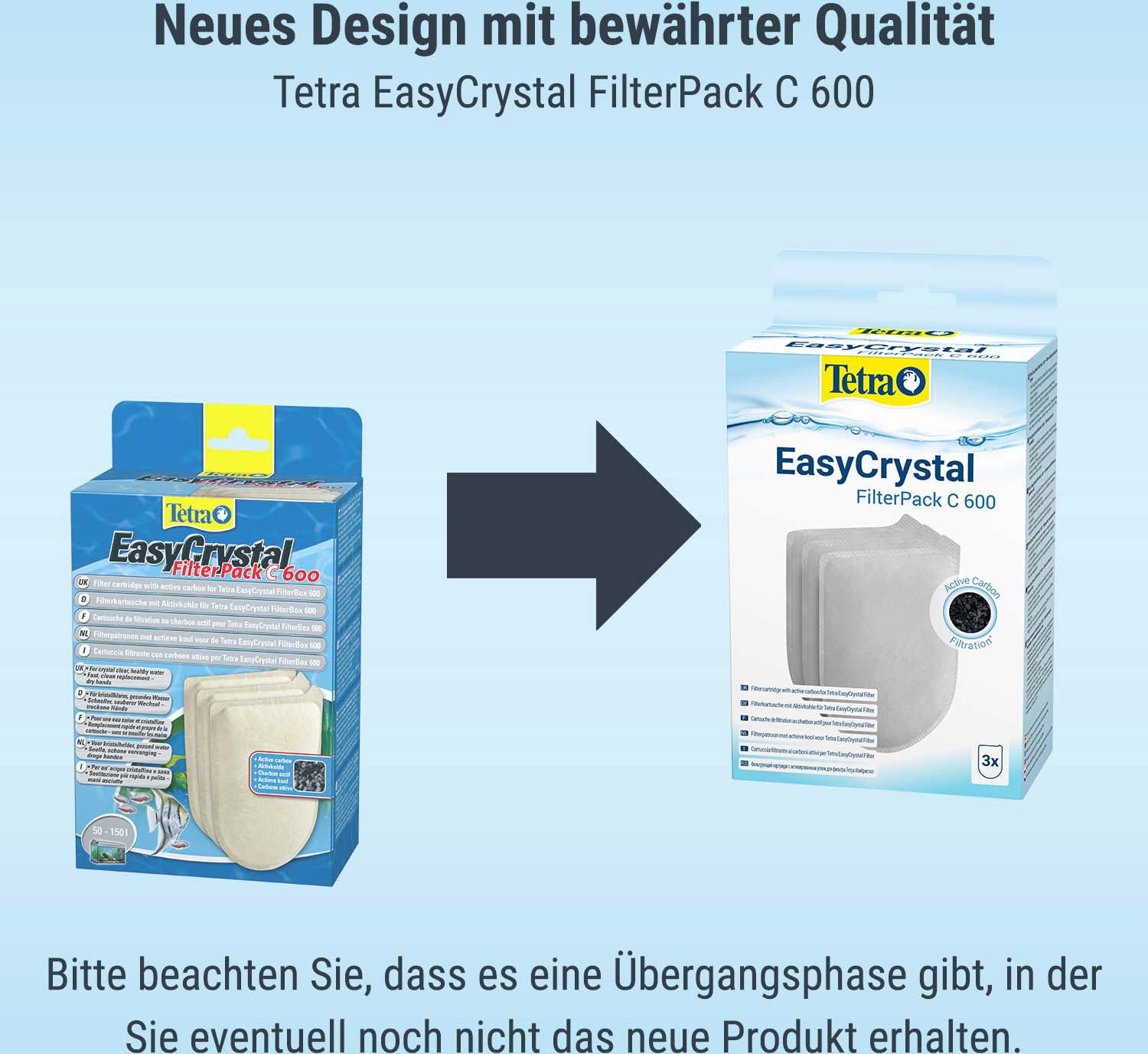 Tento výrobek s aktivním uhlím - určený k chemické úpravě vody v akváriích o objemu 50-100 litrů - je určen k použití s EasyCrystal FilterBox 600, který díky mechanické, biologické a chemické filtraci umožněné inovativní filtrační vložkou zaručuje křišťálově čistou a zdravou vodu. Při mechanické filtraci dvouvrstvá filtrační tkanina spolehlivě odstraní i ty nejmenší suspendované částice. Bílá strana slouží k předfiltraci větších částic a zelená strana k jemné filtraci. Pro biologickou filtraci se používá filtrační mřížka Bio-Grid s mimořádně velkou plochou pro kolonizaci bakteriemi užitečnými pro čištění přes filtrační mřížku "EasyCrystal". Speciální aktivní uhlí odstraňuje nepříjemné pachy a chemicky čistí vodu v akváriu. Čištění produktu je velmi jednoduché: filtrační vložky je třeba vyměnit každé 4 týdny.