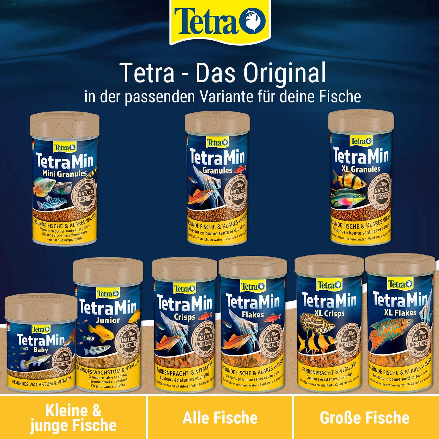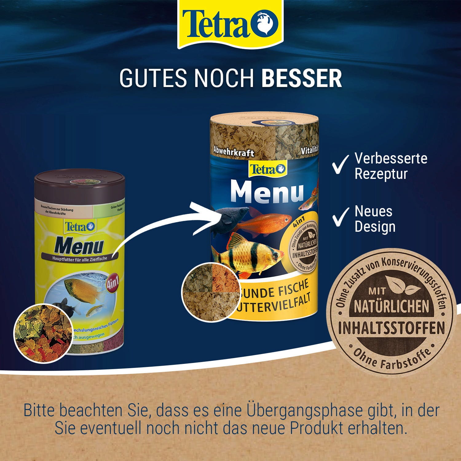 Menu je základní krmivo pro všechny okrasné ryby ve sladkovodních akváriích a skládá se ze 4 různých speciálních vloček s vitamíny, minerály a stopovými prvky, které zajišťují pestrou a vyváženou stravu. Červené vločky s přírodními zvýrazňovači barev zajišťují krásné zbarvení. Hnědé vločky obsahují speciální kombinaci vitamínů pro posílení imunitního systému. Zelené vločky nabízejí rostlinné látky pro vysokou vitalitu, zatímco žluté vločky mají optimalizovaný poměr bílkovin a tuků pro zdravý růst. Krmivo lze příležitostně doplnit pamlsky, jako je například FreshDelica.