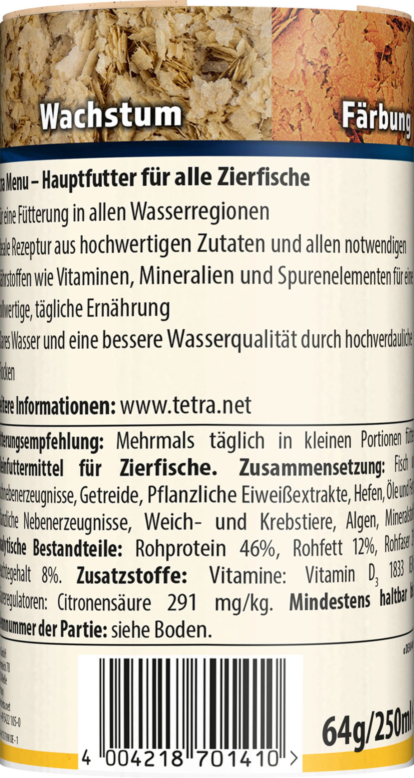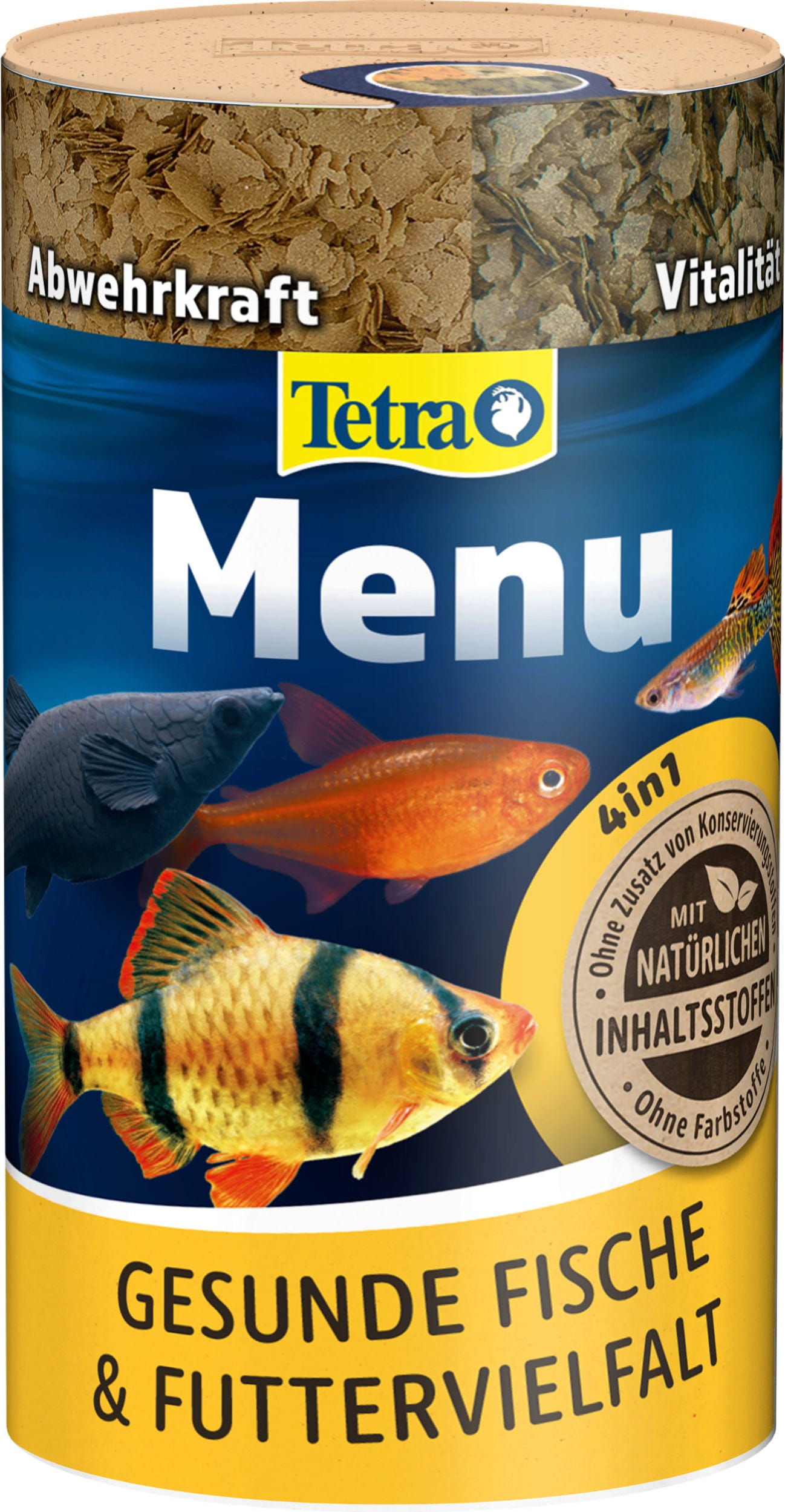 Menu je základní krmivo pro všechny okrasné ryby ve sladkovodních akváriích a skládá se ze 4 různých speciálních vloček s vitamíny, minerály a stopovými prvky, které zajišťují pestrou a vyváženou stravu. Červené vločky s přírodními zvýrazňovači barev zajišťují krásné zbarvení. Hnědé vločky obsahují speciální kombinaci vitamínů pro posílení imunitního systému. Zelené vločky nabízejí rostlinné látky pro vysokou vitalitu, zatímco žluté vločky mají optimalizovaný poměr bílkovin a tuků pro zdravý růst. Krmivo lze příležitostně doplnit pamlsky, jako je například FreshDelica.