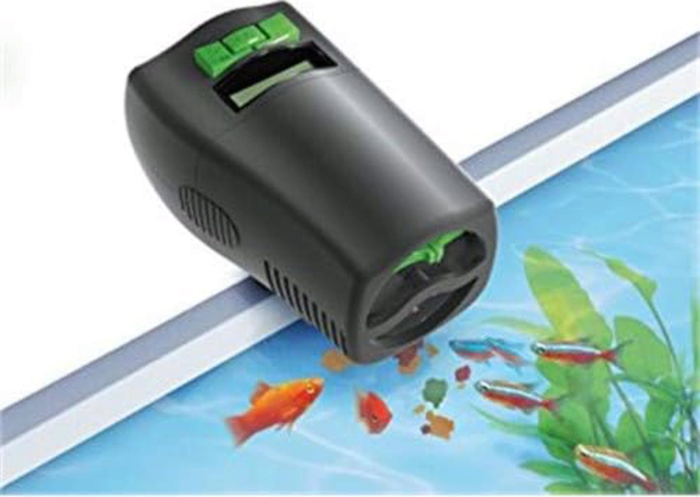 Krmítko má multifunkční možnosti montáže na okraj akvária a výškově nastavitelné nožičky. Průhledové okénko umožňuje kontrolovat množství krmiva a stav nabití baterie. Součástí doručení jsou 2 baterie VARTA s dlouhou životností.