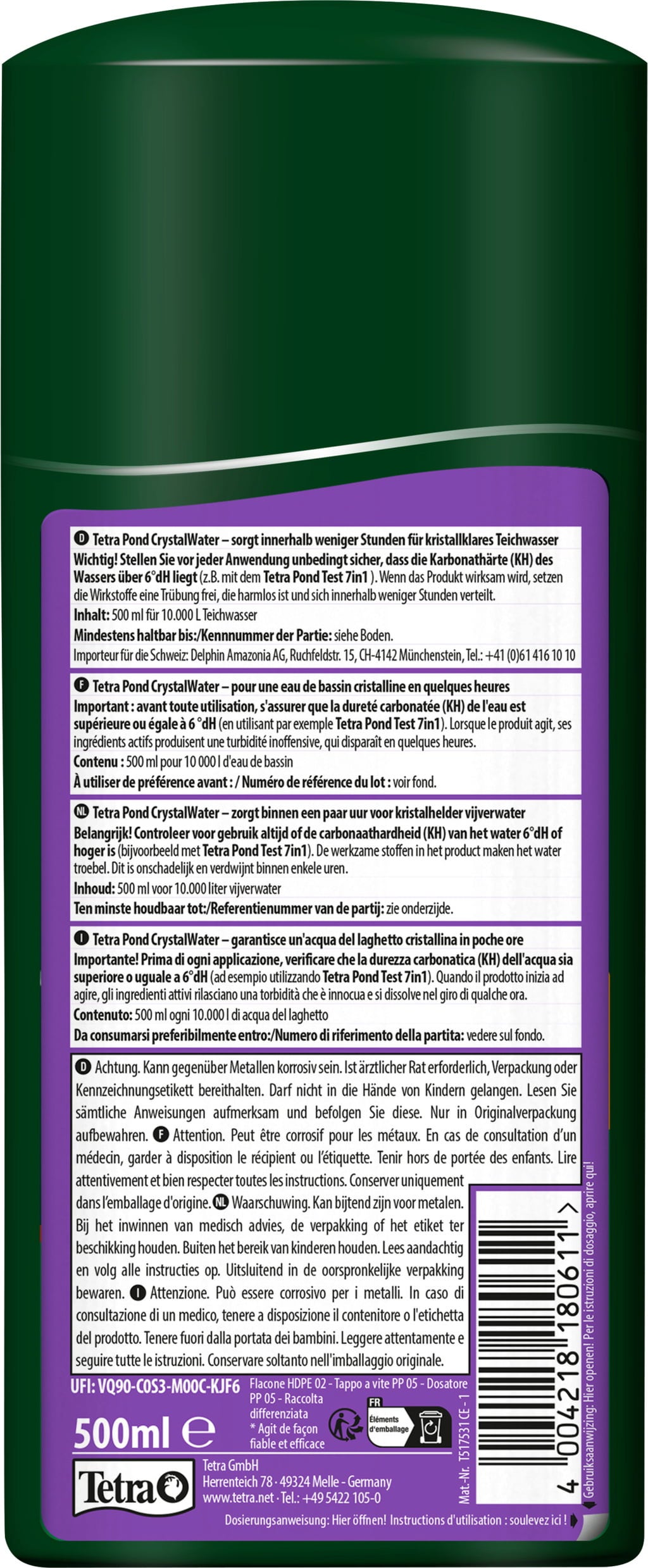 Pond CrystalWater je přípravek určený k rychlému a bezpečnému odstranění plovoucích částic nečistot v zahradních jezírkách. Přípravek působí během několika hodin a viditelně zlepšuje kvalitu vody. Pond CrystalWater je určen pro případy minerálního zákalu způsobeného částicemi jílu nebo substrátu, stejně jako organického zákalu způsobeného trusem ryb, nesnědenou potravou nebo odumřelým rostlinným materiálem. Účinné látky v přípravku flokují částice ve vodě tak, aby mohly být následně odstraněny síťkou nebo zachyceny filtrem.